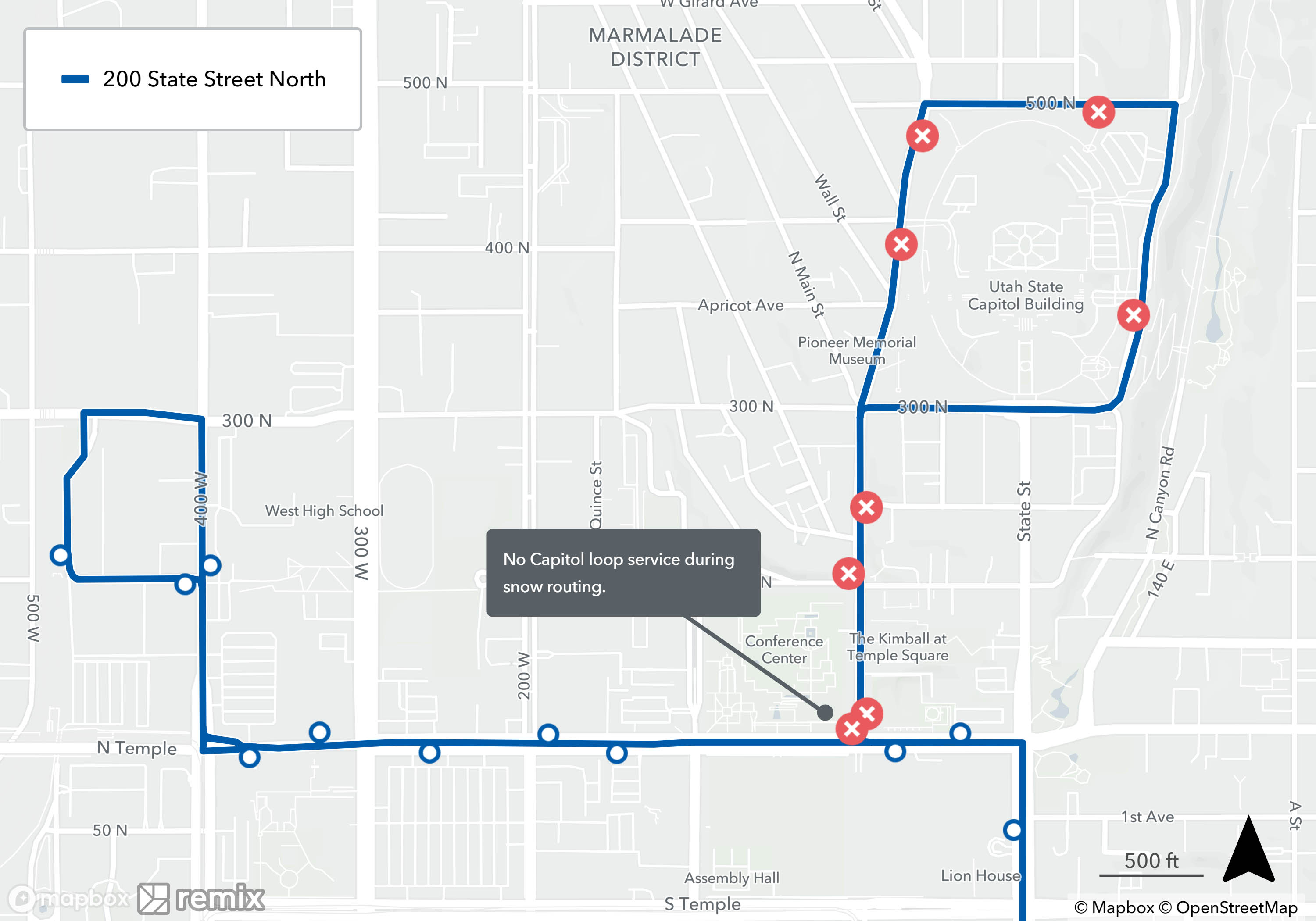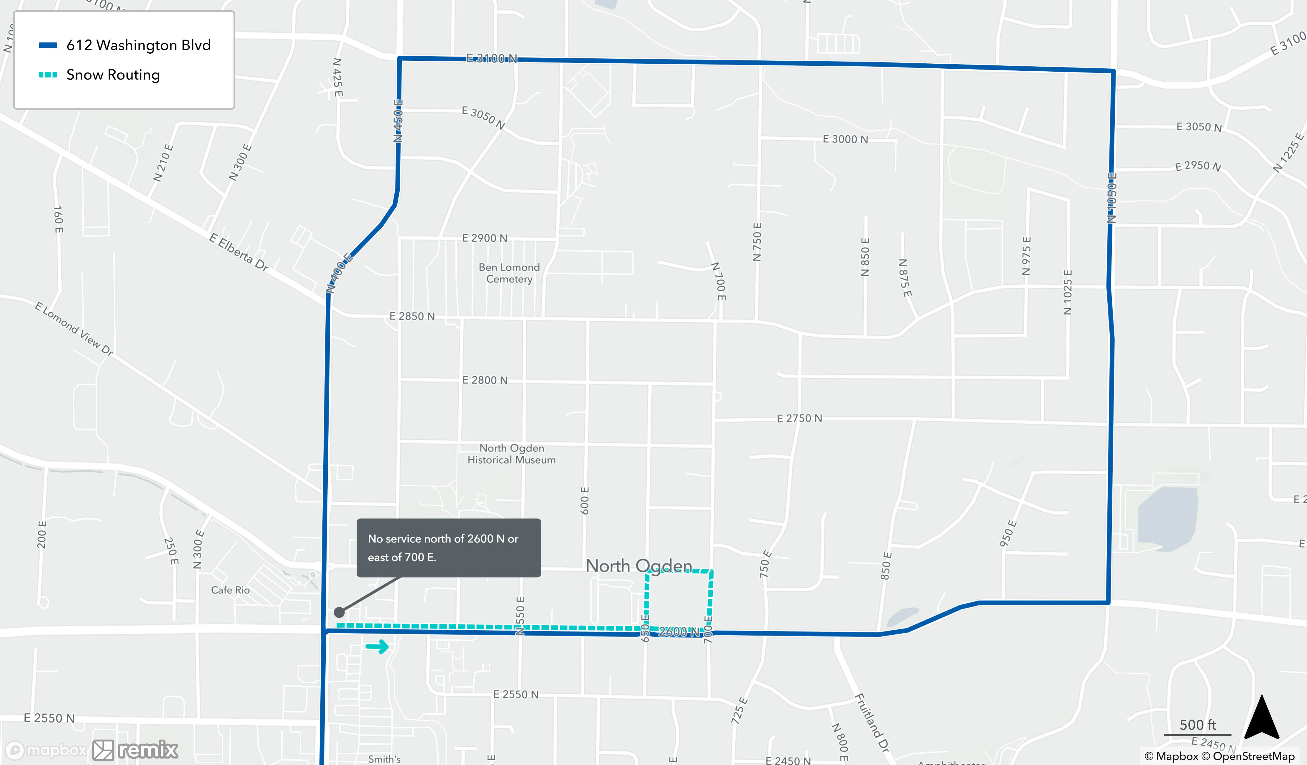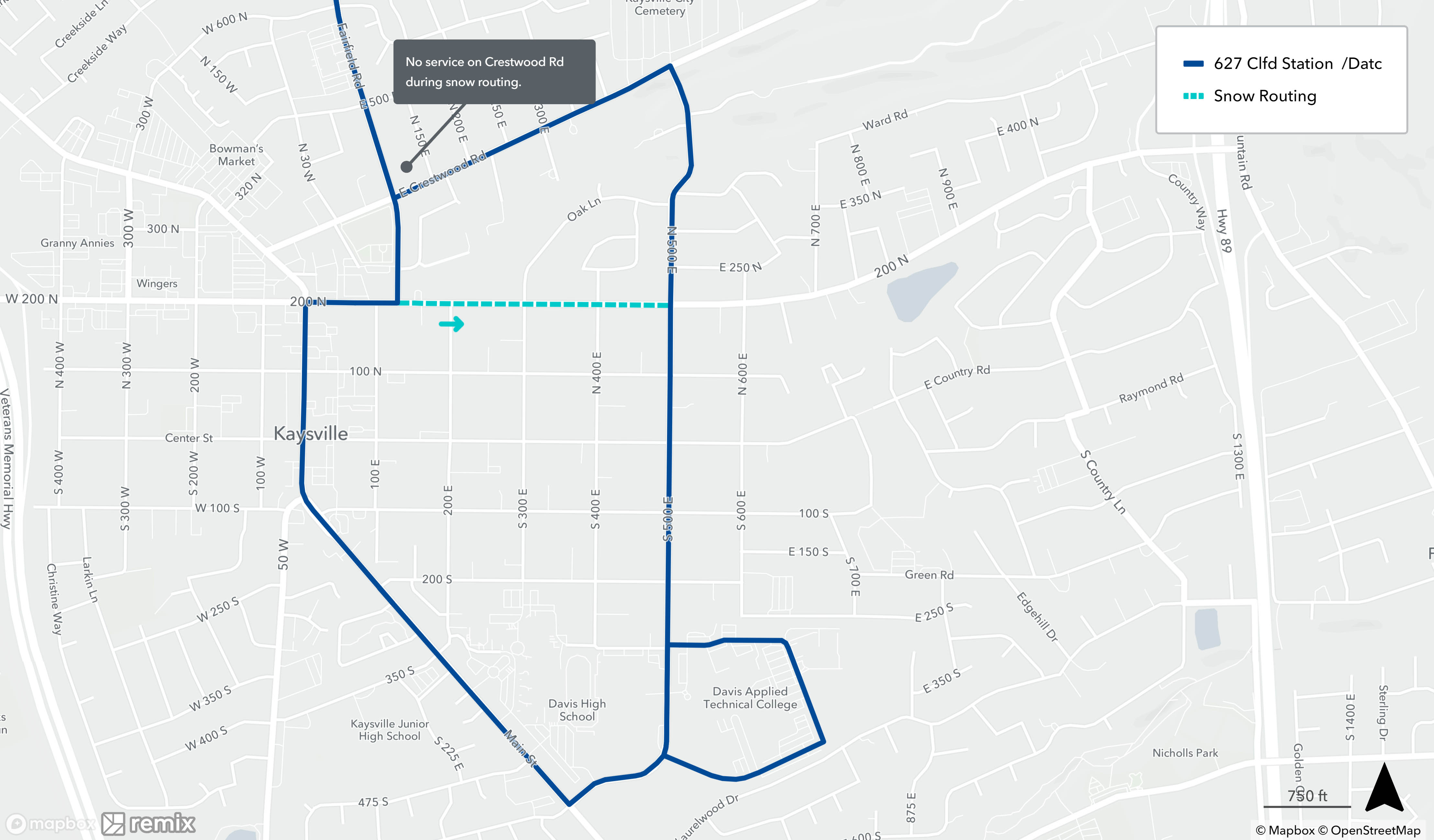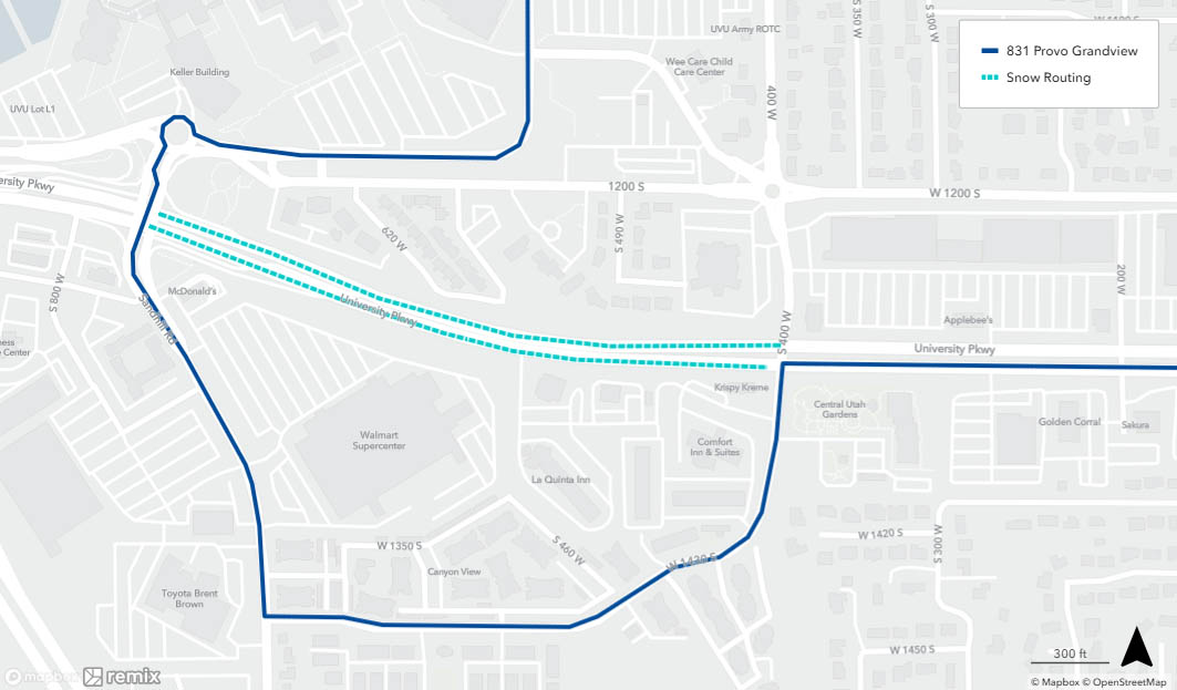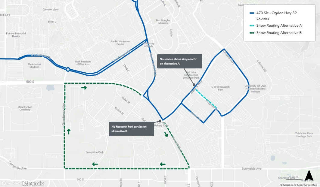 Snow routing occurs when UTA buses are unable to follow their regular route due to inclement weather. If there is a substantial amount of snow or ice on the roads, buses will avoid steep hills in favor of safer routes. Snow routing only affects select UTA bus routes and stops and is only put into place during or immediately after severe weather. Once roads are cleared, buses will resume their regular routes.