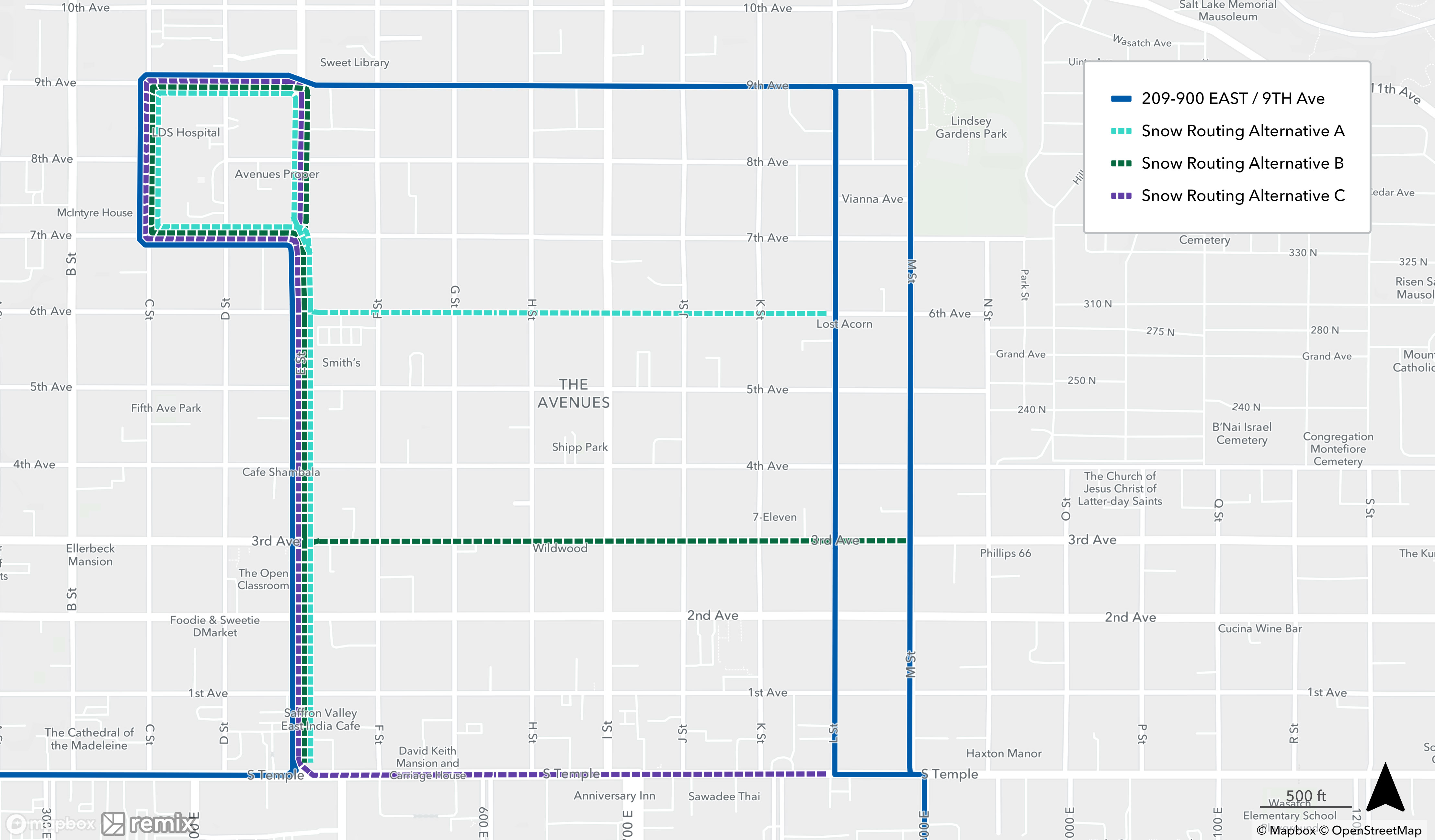 When a bus is on snow routing, it will detour from its regular route. You may need to catch your bus at a different location during this time. See below to find your route’s specific snow routing map to determine where to catch the bus. If you need assistance, please call 801-743-3882 or contact us on Twitter at @RideUTA or sign up to receive route-specific notifications.